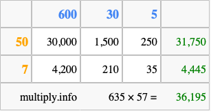 Finally, we add up all the sums we found in step 3 to get our final answer to 635 times 57.