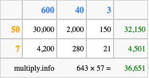 That's all there is to it! As you can see from the box above, the answer to 643 times 57 using the box method is 36,651.
