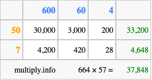 That's all there is to it! As you can see from the box above, the answer to 664 times 57 using the box method is 37,848.