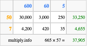 Below is an illustration showing you how to calculate 665 times 57 using the box method, using the instructions above.