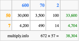 That's all there is to it! As you can see from the box above, the answer to 672 times 57 using the box method is 38,304.