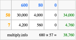 Below is an illustration showing you how to calculate 680 times 57 using the box method, using the instructions above.