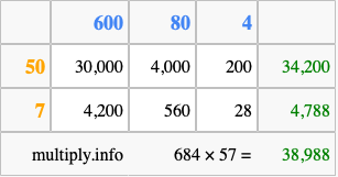 That's all there is to it! As you can see from the box above, the answer to 684 times 57 using the box method is 38,988.
