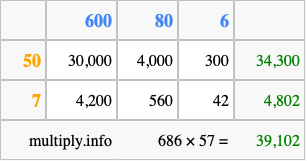 That's all there is to it! As you can see from the box above, the answer to 686 times 57 using the box method is 39,102.