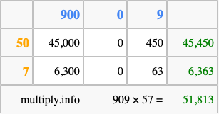 That's all there is to it! As you can see from the box above, the answer to 909 times 57 using the box method is 51,813.