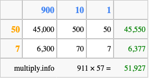 That's all there is to it! As you can see from the box above, the answer to 911 times 57 using the box method is 51,927.