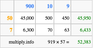 That's all there is to it! As you can see from the box above, the answer to 919 times 57 using the box method is 52,383.