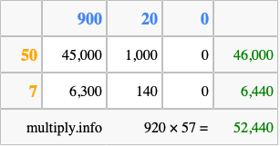 That's all there is to it! As you can see from the box above, the answer to 920 times 57 using the box method is 52,440.
