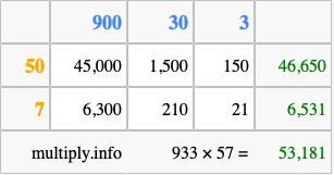Below is an illustration showing you how to calculate 933 times 57 using the box method, using the instructions above.