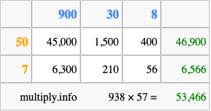 That's all there is to it! As you can see from the box above, the answer to 938 times 57 using the box method is 53,466.