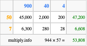 Finally, we add up all the sums we found in step 3 to get our final answer to 944 times 57.