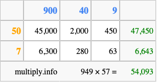 That's all there is to it! As you can see from the box above, the answer to 949 times 57 using the box method is 54,093.