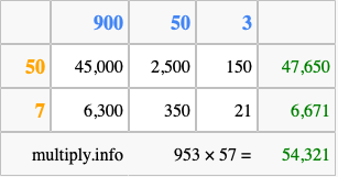 Below is an illustration showing you how to calculate 953 times 57 using the box method, using the instructions above.