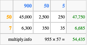Below is an illustration showing you how to calculate 955 times 57 using the box method, using the instructions above.