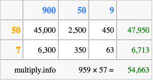 Below is an illustration showing you how to calculate 959 times 57 using the box method, using the instructions above.