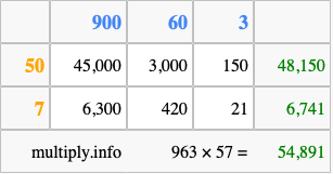 Finally, we add up all the sums we found in step 3 to get our final answer to 963 times 57.