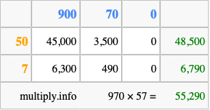 Finally, we add up all the sums we found in step 3 to get our final answer to 970 times 57.