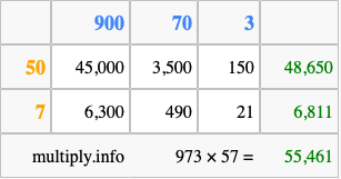 That's all there is to it! As you can see from the box above, the answer to 973 times 57 using the box method is 55,461.