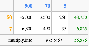 Finally, we add up all the sums we found in step 3 to get our final answer to 975 times 57.