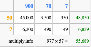 That's all there is to it! As you can see from the box above, the answer to 977 times 57 using the box method is 55,689.