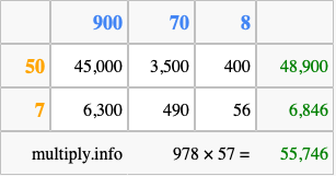 That's all there is to it! As you can see from the box above, the answer to 978 times 57 using the box method is 55,746.