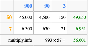 That's all there is to it! As you can see from the box above, the answer to 993 times 57 using the box method is 56,601.