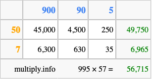 That's all there is to it! As you can see from the box above, the answer to 995 times 57 using the box method is 56,715.