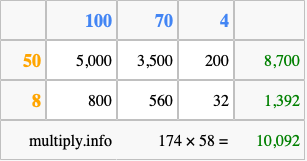 That's all there is to it! As you can see from the box above, the answer to 174 times 58 using the box method is 10,092.