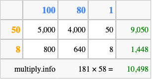 That's all there is to it! As you can see from the box above, the answer to 181 times 58 using the box method is 10,498.