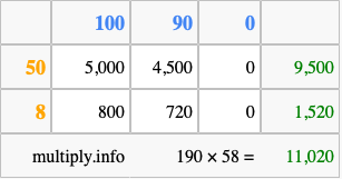 Finally, we add up all the sums we found in step 3 to get our final answer to 190 times 58.
