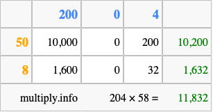 That's all there is to it! As you can see from the box above, the answer to 204 times 58 using the box method is 11,832.