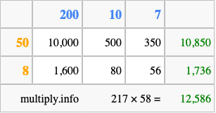Below is an illustration showing you how to calculate 217 times 58 using the box method, using the instructions above.