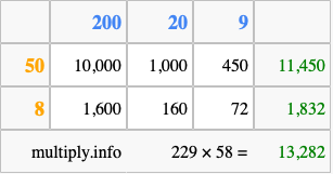 That's all there is to it! As you can see from the box above, the answer to 229 times 58 using the box method is 13,282.