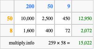 That's all there is to it! As you can see from the box above, the answer to 259 times 58 using the box method is 15,022.