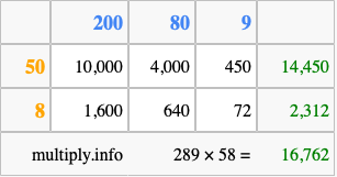 That's all there is to it! As you can see from the box above, the answer to 289 times 58 using the box method is 16,762.