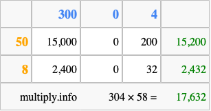 That's all there is to it! As you can see from the box above, the answer to 304 times 58 using the box method is 17,632.