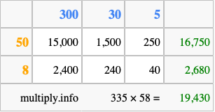 Below is an illustration showing you how to calculate 335 times 58 using the box method, using the instructions above.