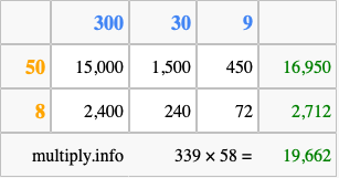 Finally, we add up all the sums we found in step 3 to get our final answer to 339 times 58.