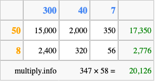 Below is an illustration showing you how to calculate 347 times 58 using the box method, using the instructions above.