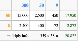 That's all there is to it! As you can see from the box above, the answer to 359 times 58 using the box method is 20,822.