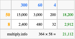 Finally, we add up all the sums we found in step 3 to get our final answer to 364 times 58.