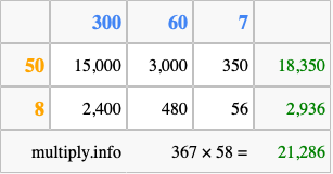 That's all there is to it! As you can see from the box above, the answer to 367 times 58 using the box method is 21,286.