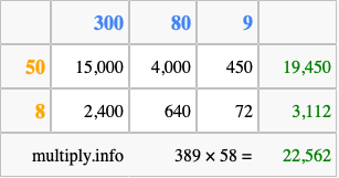 That's all there is to it! As you can see from the box above, the answer to 389 times 58 using the box method is 22,562.