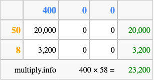 That's all there is to it! As you can see from the box above, the answer to 400 times 58 using the box method is 23,200.