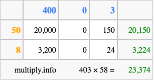 Finally, we add up all the sums we found in step 3 to get our final answer to 403 times 58.