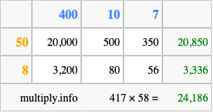 That's all there is to it! As you can see from the box above, the answer to 417 times 58 using the box method is 24,186.