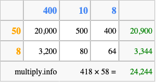 That's all there is to it! As you can see from the box above, the answer to 418 times 58 using the box method is 24,244.