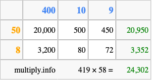 Finally, we add up all the sums we found in step 3 to get our final answer to 419 times 58.