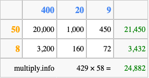 That's all there is to it! As you can see from the box above, the answer to 429 times 58 using the box method is 24,882.