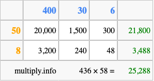 That's all there is to it! As you can see from the box above, the answer to 436 times 58 using the box method is 25,288.